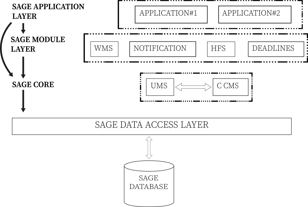 The SAGE Core consists of two basic systems; the User Management System (UMS) and the Category Code Management System (CCMS). These systems are tightly coupled to each other and are core to all of the sage modules and applications. To maintain a truly transactional system – code dependency is tightly controlled with the sage core systems having dependencies only to the Data Access Layer. The next system layer is the Sage Module Layer which has tightly controlled dependencies only to SAGE core and Data Access Layer.