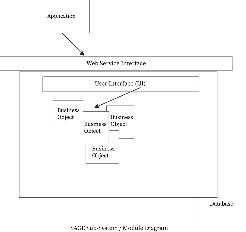 The SAGE software has a multiple layer approach separating interfaces, business rules, data access layer and data, each capable of containing sub-layers. The User Interface layer consists of aspx documents providing an interface used to display the results of the Business Rules for users. The Business Rules layer (BL) contains the business rules and business data manipulation (the brains of the application). The data layer contains all the data. The user interface or the web service interface is the layer that is exposed to the user or other applications. The business logic is concealed within the Business Logic Layer and is not exposed to the user or other applications. The interfaces can access the data only through the business logic layer. The business logic classes can access the database through the data access layer, thus ensuring the data security.